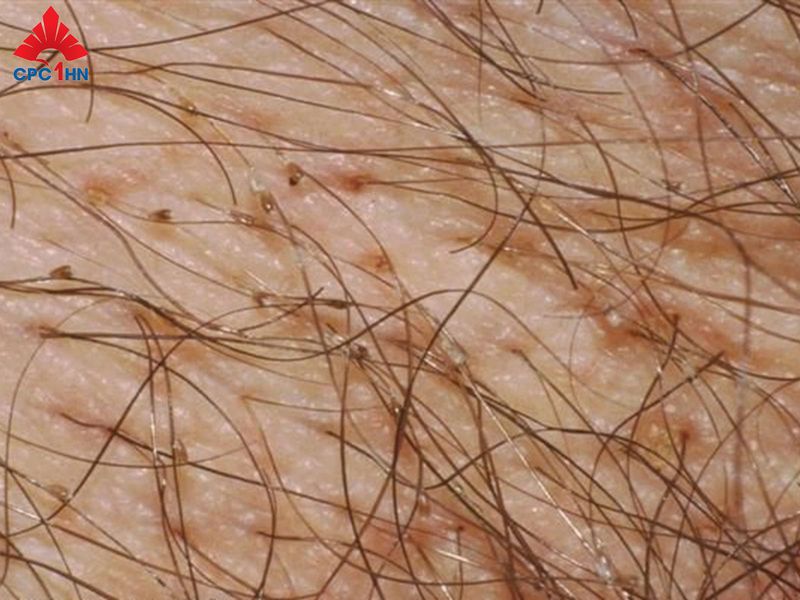 Xuất hiện vết cắn li ti màu đỏ hoặc xanh xám trên da, thường tập trung quanh lông mu.