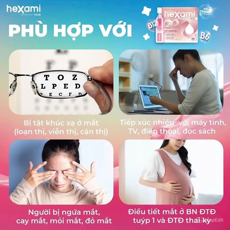 Bạn có biết, khi mắt phải làm việc quá mức với máy tính, điện thoại hoặc trong môi trường nhiều bụi/ánh sáng mạnh, các triệu chứng như khô mắt, mỏi mắt, đỏ mắt… rất dễ xảy ra? Hexami Newlight Plus chính là giải pháp nhỏ mắt vitamin B ưu việt, được thiết kế đặc biệt để giảm các khó chịu này, giúp mắt luôn thoải mái và năng động dù bạn phải nhìn màn hình cả ngày.