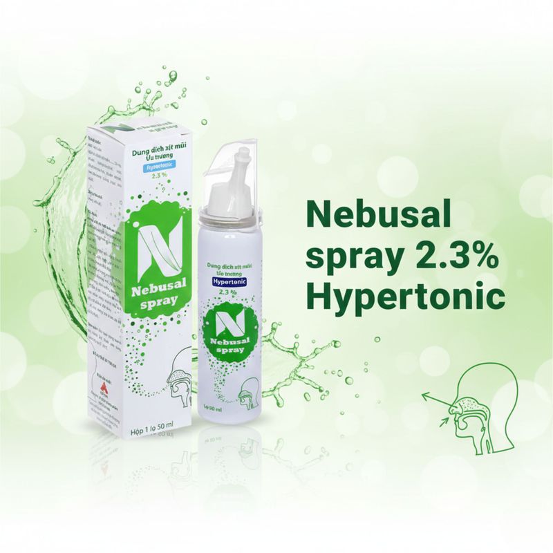 Nebusal Spray 2,3% là dung dịch xịt mũi nước muối ưu trương, thường được sử dụng trong các trường hợp trẻ bị nghẹt mũi, sổ mũi do cảm lạnh, viêm mũi hoặc thay đổi thời tiết. Với nồng độ muối cao hơn nước muối sinh lý thông thường, sản phẩm giúp hút bớt dịch nhầy, giảm phù nề niêm mạc mũi và hỗ trợ làm thông thoáng đường thở cho trẻ.