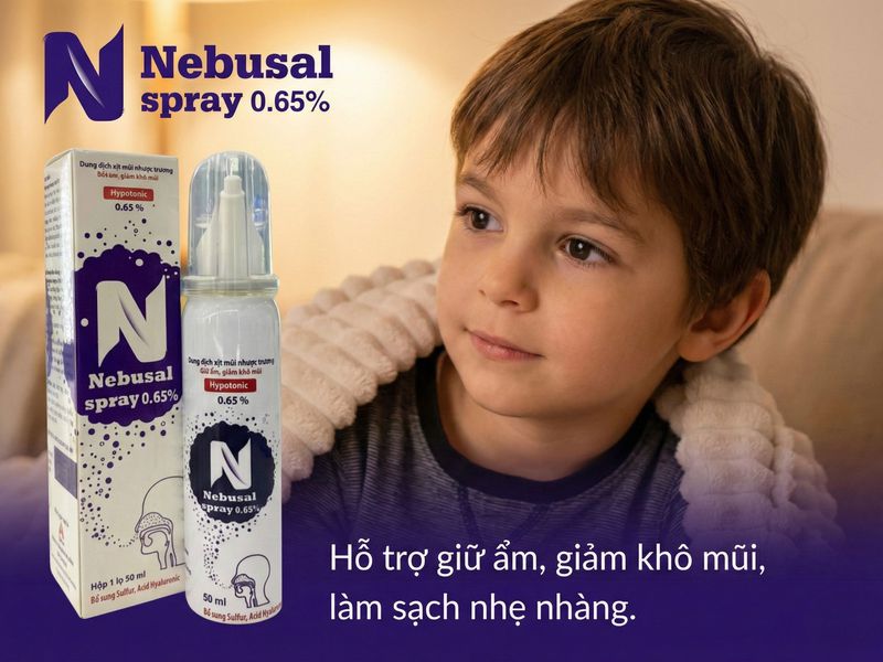 Nebusal 0,65% là dung dịch muối nhược trương nhẹ nhàng, kết hợp natri hyaluronat và muối sulfua, giúp cấp ẩm cho niêm mạc mũi, làm giảm nghẹt mũi khi thời tiết hanh khô hoặc trẻ nằm điều hòa. Sản phẩm phù hợp với trẻ sơ sinh và trẻ nhỏ, đặc biệt trong những ngày khô hanh, giúp mũi bé luôn thông thoáng và mềm mại.
