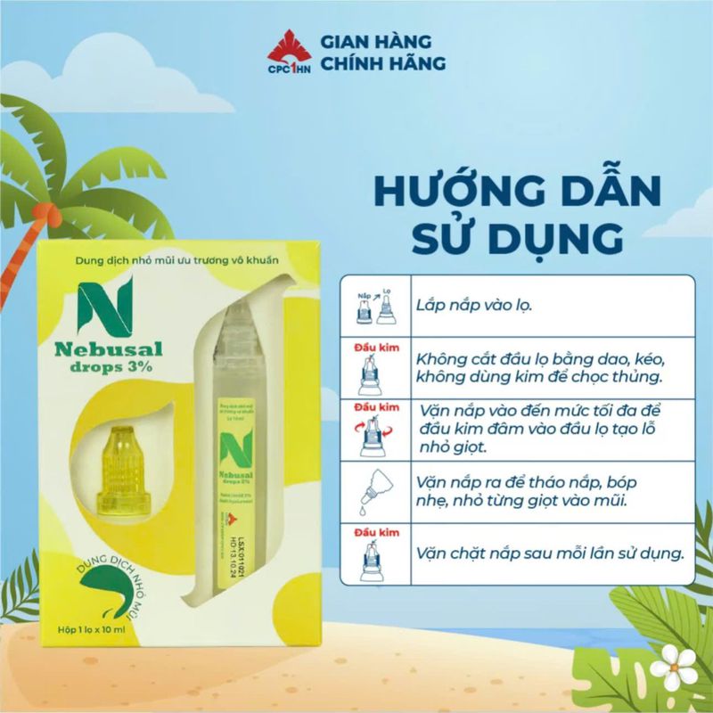 Nebusal Drops 3% là dung dịch nhỏ mũi chứa muối biển ưu trương 3%, kết hợp Natri Hyaluronate và Thymol chiết xuất từ cỏ xạ hương. Sản phẩm được phát triển bởi Dược phẩm CPC1 Hà Nội, ứng dụng công nghệ BFS (Blow-Fill-Seal) đạt chuẩn châu Âu, giúp đảm bảo vô trùng tuyệt đối.