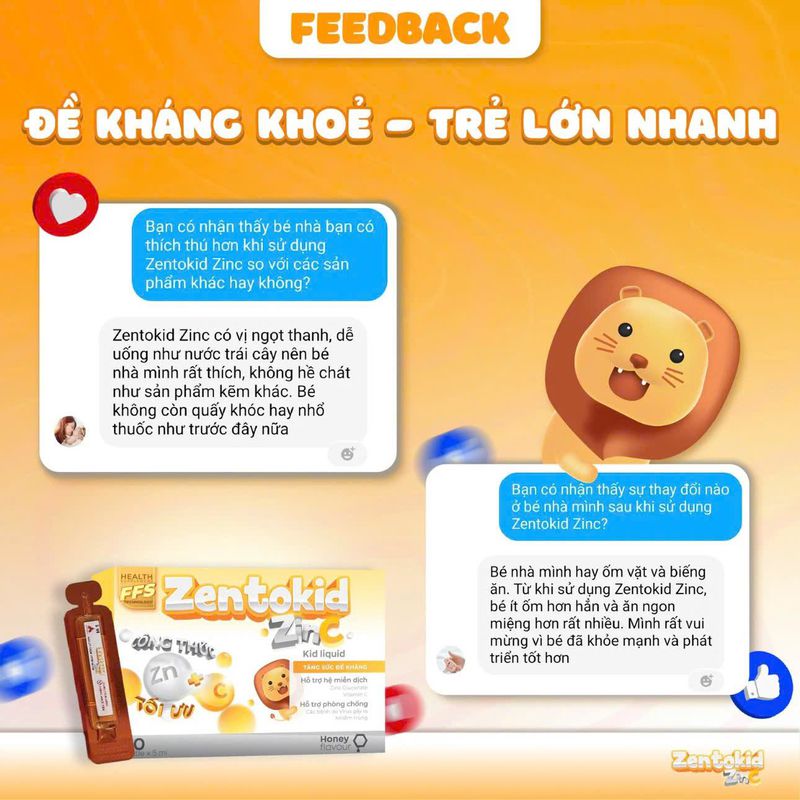 Sau một thời gian sử dụng sản phẩm bổ sung Zentokid Zinc, nhiều phụ huynh chia sẻ rằng họ cảm nhận rõ rệt sự cải thiện về sức khỏe, sức đề kháng và thói quen ăn uống của con. Zentokid Zinc giúp các bậc cha mẹ yên tâm hơn trong hành trình chăm sóc con nhỏ, nhất là với những bé biếng ăn, hay ốm vặt hoặc đang trong giai đoạn tăng trưởng nhanh.