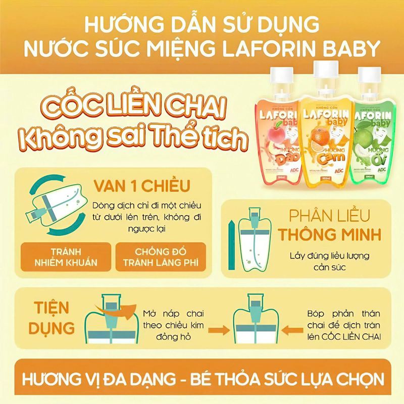 Đa dạng hương vị trái cây, bé thoả thích lựa chọn: Laforin Baby có nhiều hương vị tự nhiên dễ chịu như cam, đào, ổi, phù hợp với khẩu vị của trẻ nhỏ. Nhờ mùi thơm ngọt nhẹ và không gây cay nồng, trẻ sẽ dễ dàng hợp tác, biến việc súc miệng thành một hoạt động thú vị mỗi ngày.