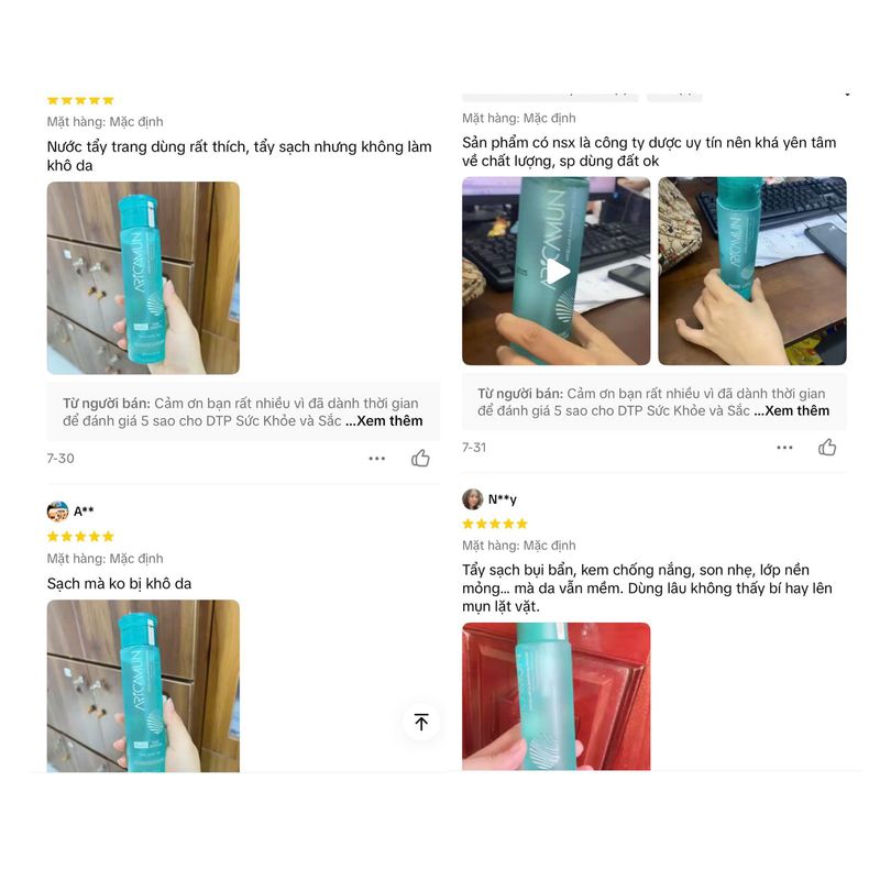 Sau một thời gian sử dụng, nhiều người dùng đã có những phản hồi tích cực về sản phẩm nước tẩy trang Aricamun Micellar Cleansing Water. Dưới đây là một số chia sẻ: