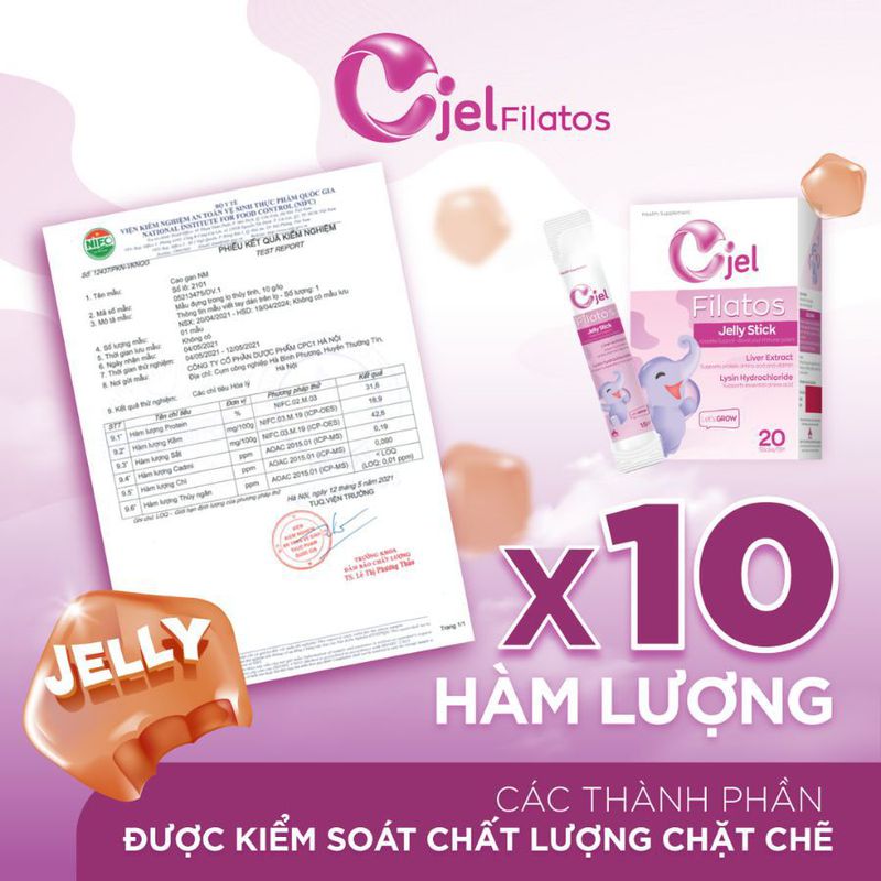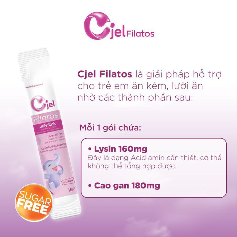 Đây là lựa chọn hợp lý cho mẹ và bé muốn chọn vitamin và khoáng chất chăm sóc bé yêu một cách an toàn, tiện lợi và hiệu quả. Thạch ăn liền Cjel Filatos giúp trẻ hoặc người lo lắng về cân nặng ăn uống tốt hơn, hấp thu dưỡng chất hiệu quả hơn. Trong khi đó, chiết xuất từ gan động vật chứa các vitamin nhóm B, sắt, men tiêu hóa, giúp làm dịu hệ tiêu hóa, giúp bé ăn ngon miệng mà không bị đầy hơi hoặc khó tiêu. Đồng thời góp phần nâng cao sức đề kháng dịu nhẹ cho cơ thể.
