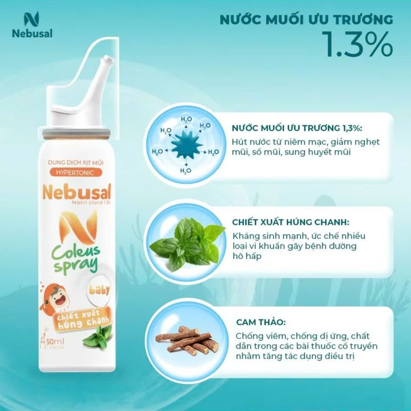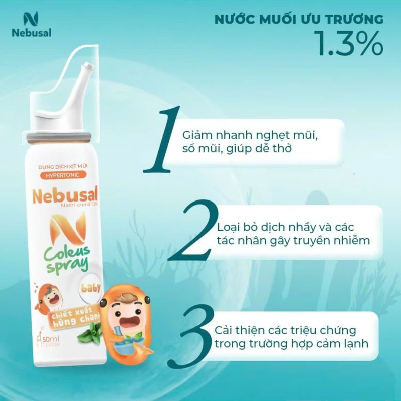 Nebusal Coleus Spray Baby với thành phần an toàn từ thiên nhiên, cơ chế làm sạch hiệu quả giúp bé dễ thở, bớt quấy khóc mà còn giúp cha mẹ an tâm hơn trong hành trình chăm sóc con yêu mỗi ngày. Hãy chủ động bảo vệ sức khỏe mũi cho bé từ sớm để bé được phát triển trọn vẹn, vui khỏe và lớn lên trong những ngày thơ ấu êm dịu, tràn đầy yêu thương.